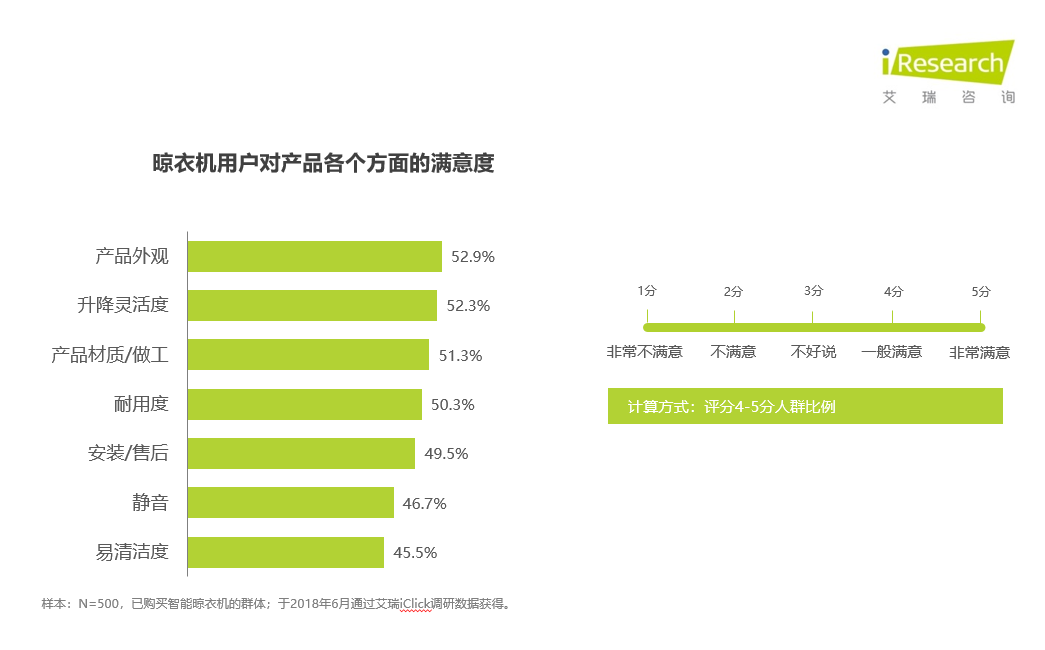 智能晾衣機的產(chǎn)品外觀成為黑馬,是用戶最為滿意的方面;其次,自動升降作為智能晾衣機的核心功能,升降的靈活度受到用戶好評。產(chǎn)品材質/做工、耐用度方面的滿意度均超出50%。