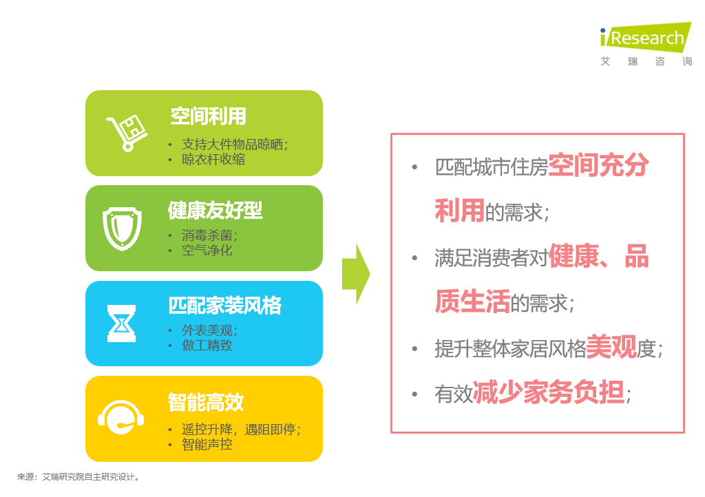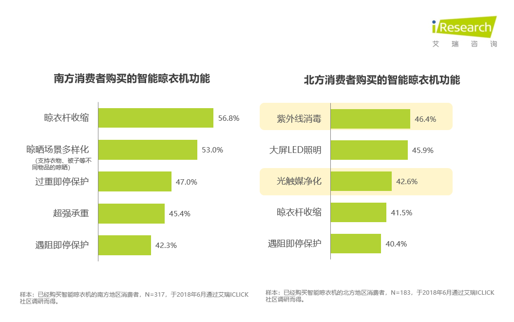 南方消費者所使用的晾曬場景主要是固定晾衣桿,并且南方氣候更為潮濕炎熱,晾曬的需求較大,對晾曬等基礎功能要求較高,更為關注晾衣桿收縮、晾曬場景多樣化、過重即停保護等基礎功能的升級。北方消費者則更為關注紫外線消毒、照明、光觸媒凈化等健康保護功能。