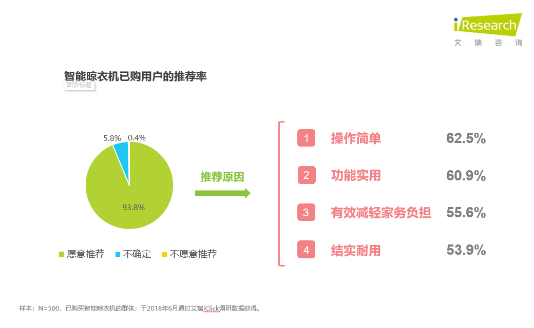 已經(jīng)購買智能晾衣機的用戶中,93.8%的用戶愿意將該產(chǎn)品推薦給親友,推薦原因中,操作簡單排在首位,其次為功能實用和有效減輕家務負擔。智能晾衣機的實用性經(jīng)得起市場的考驗。