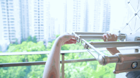 過去江家的陽(yáng)臺(tái),只有兩條鐵桿當(dāng)晾桿,晾曬的空間非常有限,還需要人力一件一件反復(fù)去掛衣服,有時(shí)候洗了床單被子,晾桿就不夠用,只能在陽(yáng)臺(tái)找其他位置晾,陽(yáng)臺(tái)變成了雜亂的曬衣房,一點(diǎn)也不美觀。