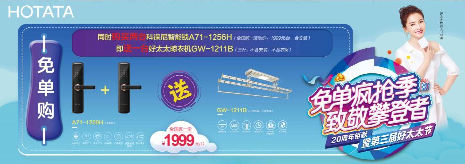 *免單購:同時購買兩臺科徠尼智能鎖A71-1256H(全國統(tǒng)一活動價:1999元/臺,含安裝),即送一臺好太太晾衣機(jī)GW-1211B(三桿,不含安裝,不含衣架)