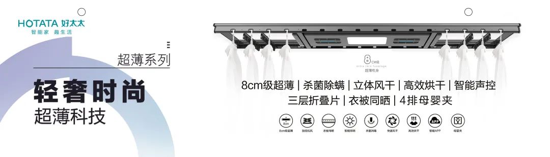 為滿(mǎn)足人們防疫需求,好太太智能晾衣機(jī)配備智能殺菌消毒功能,紫外線(xiàn)除菌消毒做到99%有效殺菌,守護(hù)衣物健康。
