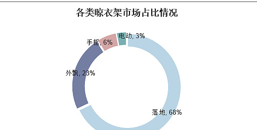 晾衣架一般可分為落地、外飄、手搖和電動四種。其中落地式晾衣架是目前最主要的產(chǎn)品,其市場份額占比近七成。主要是由于落地式晾衣架占地面積較小,便于移動和折疊,價位不高,而且通常與其他類型晾衣架搭配使用,所以落地式晾衣架深受大眾喜歡。