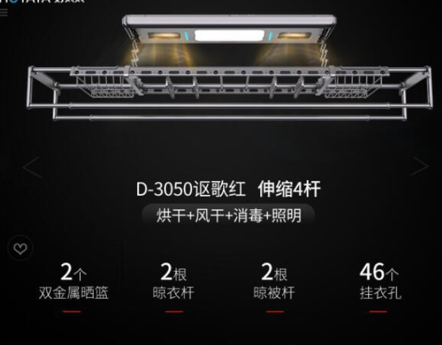 是好太太晾衣架的旗艦版,而且創(chuàng)新功能有很多,例如支持語音控制晾衣架,可以升高、降低等!并且這款的話具有烘干、風干、消毒、照明等功能!可以用TM精靈控制或者說手機也可以控制,手機上app一鍵控制也可以!