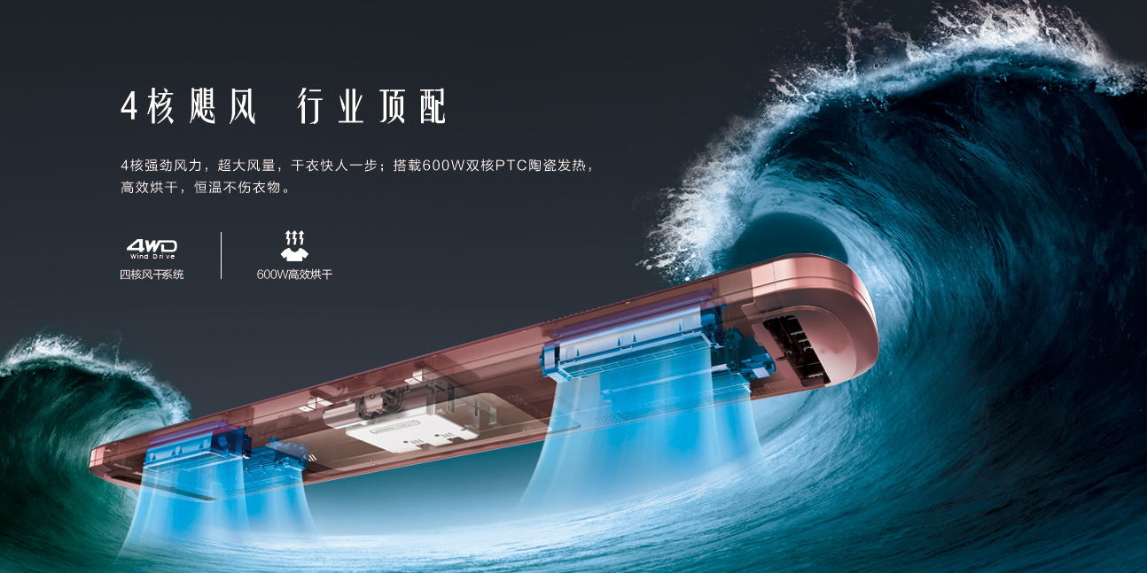 自主研發(fā)第三代動力系統(tǒng),最大承重可達50KG。超強4核颶風,超大風量,搭載600W雙核PTC陶瓷發(fā)熱,高效烘干。